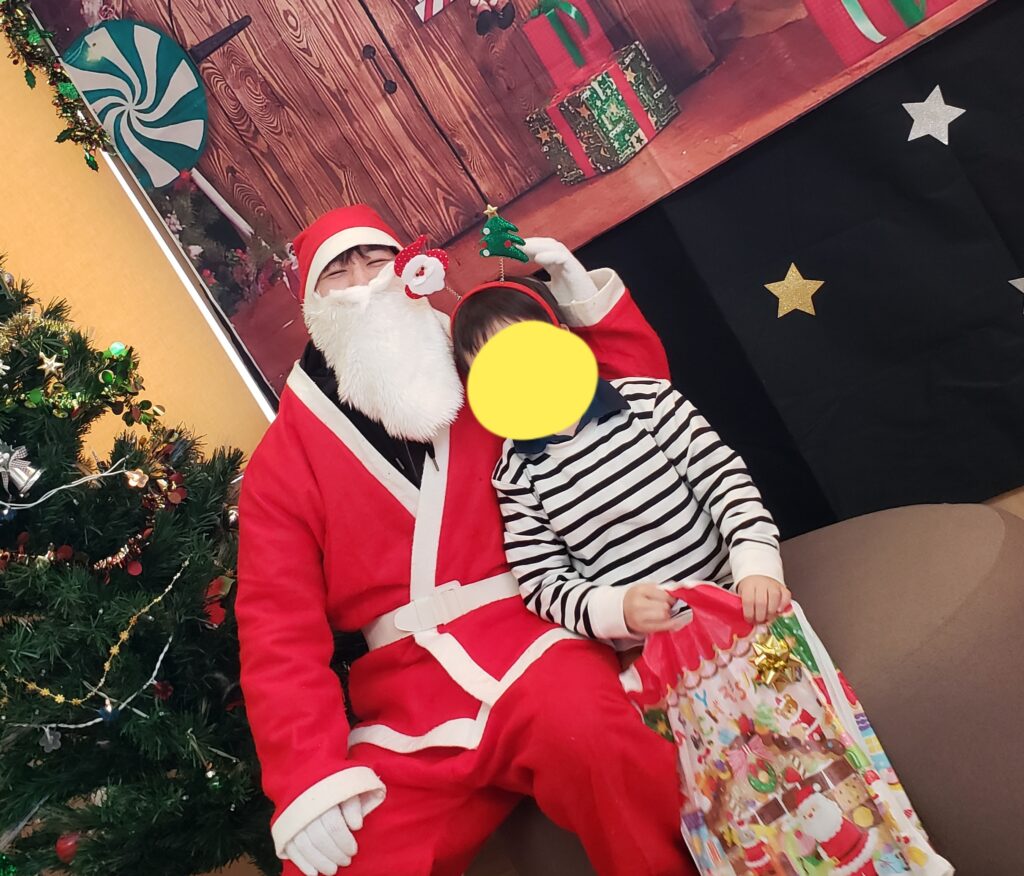 とてもうれしそうな顔をしてサンタさんからプレゼントをもらって、一緒に写真を撮りました。